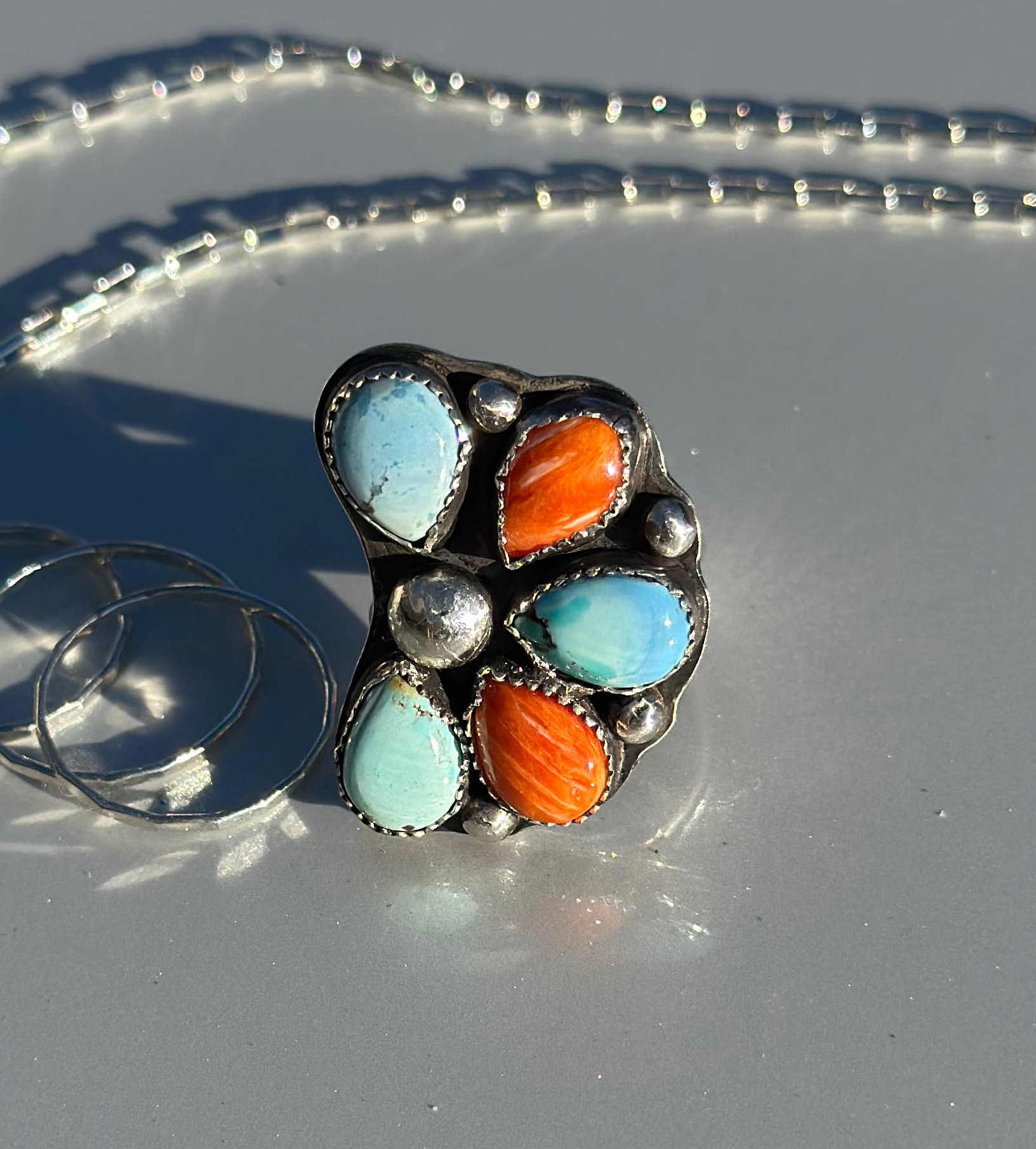 Golden Hills turquoise and Spiny Oyster and sterling silver ring